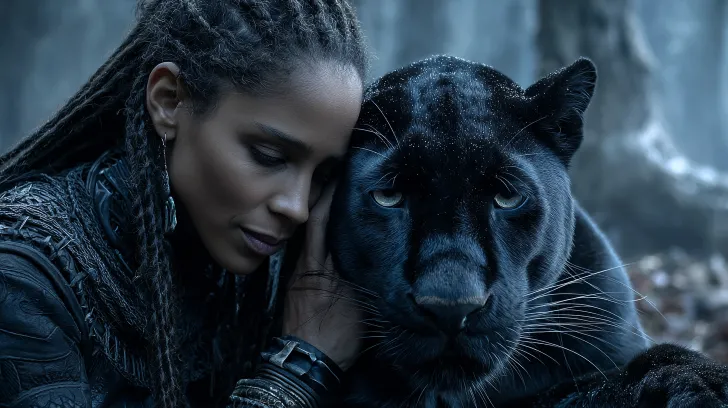 Midjourney Bot 更新时间:2026-02-17 00:30美女模特蜷缩依偎在一只巨大的黑豹怀里,周围迷雾弥漫,身穿黑色时尚服装,荒原中,神秘,迷雾, 极简高端场景,艺术故事画面,胶片色彩,胶片摄影,全身拍摄 --ar 9:16 --v 7 --stylize 250
