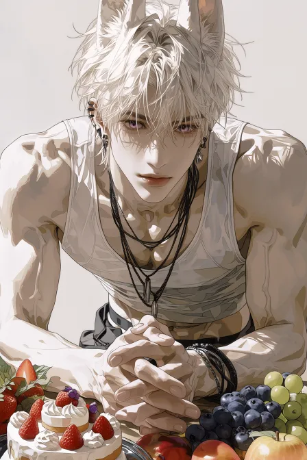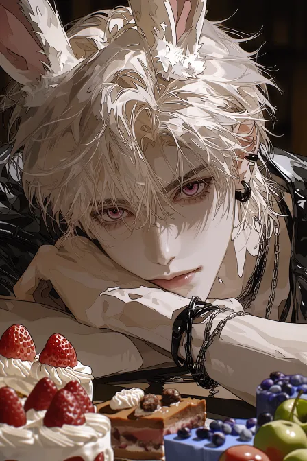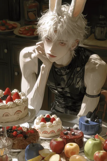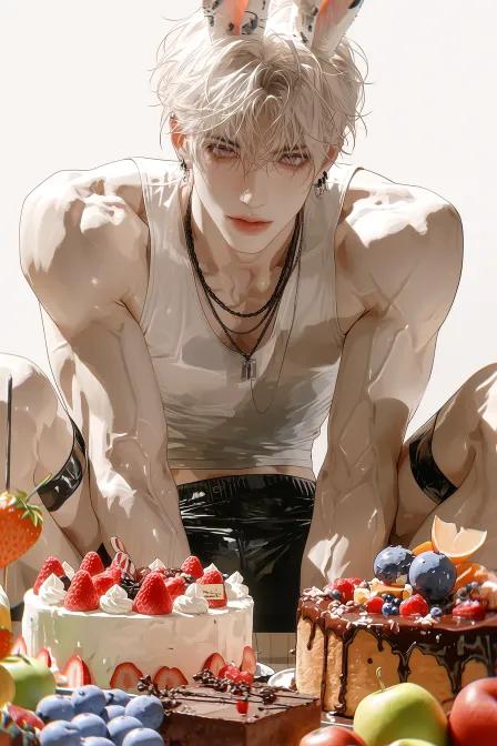 Midjourney Bot 更新时间:2026-02-17 00:30韩漫大胆笔触,韩式厚涂,线条利落,头发轮廓清晰,发丝根根分明,轮廓清晰的眼睛。千娇百媚的男子 深邃眉眼,睫毛根根分明,淡色厚唇,嘴唇泛着水光 半写实风格,厚涂CG,立体感强,超精致细节,质感丰富,层次丰厚 2.5D游戏美术质感,明显笔触细节,强烈材质对比 长兔耳少年,粉色眼睛,白色头发 穿着紧身皮衣,紧贴皮肤轮廓,肌肉饱满的双臂,脂包肌,肉肉的,看上去白白嫩嫩,但是并不干瘪。冷白皮,兔女郎服装 双腿雪白,四肢纤细微肉,黑色腿环, 戴着黑色项链,盘腿坐在餐桌之上 桌上摆满草莓蛋糕、巧克力蛋糕、蓝色蛋糕、苹果、梨子、葡萄、西瓜 角色高饱和、精致反光材质特写,背景食物低饱和 背景为餐厅,全身。 --ar 2:3 --stylize 1000 --niji 7 --no 皮夹克,裤子,穿着衣服的手臂,穿着裤子的手臂,女