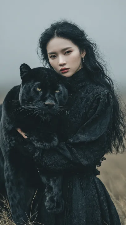 Midjourney Bot 更新时间:2026-02-17 00:21美女模特蜷缩依偎在一只巨大的黑豹怀里,周围迷雾弥漫,身穿黑色时尚服装,荒原中,神秘,迷雾, 极简高端场景,艺术故事画面,胶片色彩,胶片摄影,全身拍摄 --ar 16:9 --v 7 --stylize 250