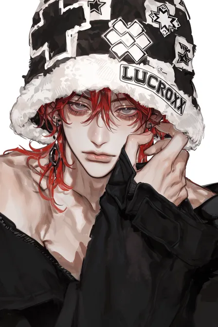 Midjourney Bot 更新时间:2026-02-17 00:34韩式厚涂风格,2.5D游戏美术质感,明显的笔触细节,强烈的材质对比,厚涂,写实,真人,年轻男性,青少年,细长眼睛,痞帅,玩味,超低饱和度,帅气,阴湿,雾霾黑瞳孔((戴着一顶带有白色虚线碎钻贴纸星星刺绣和“LUCROXX”标识的毛绒质感包头帽,红色mullet hair style从帽檐下露出,前刘海长,中间刘海超长半遮脸)),冷白皮(((黑色斜肩露肩超薄MLB长袖,领口不规则有毛边破洞,一边领口拉到肩膀下露出手臂,露出漂亮的锁骨,纤细,手指细长,长长的袖子遮住半只手,单手把耳朵扯出来))),超高清画质,特写镜头,cg写实,角色呈现20°倾斜, --ar 2:3 --stylize 400 --niji 7 --profile spr1pcg