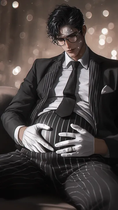 Midjourney Bot 更新时间:2026-02-17 00:41胶片颗粒感,一个俊美动漫男人,Spot Bokeh,怀孕,浓密黑发,黑色,白色,透明感肌,身穿西装,领带,白手套和眼镜,黑色碎花西服裤,坐在沙发上 --ar 9:16 --style raw --stylize 180 --niji 6 --no no