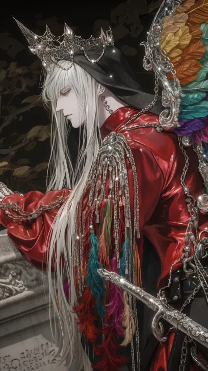 Midjourney Bot 更新时间:2026-02-17 00:41杰作, 顶级品质, 半写实, 电影般的插画,,动漫,清晰,复杂细节,最好的质量,超精细,高细节pixiv插画,画面8K清晰,暗色调,冷色调,天野喜孝风格。一个俊美动漫男人,侧身镜头,蜘蛛亮片背链,脊椎骨带有钻石,tassel背链,彩色大羽毛翅膀holding two wings,铁链colied缠绕叠戴,白色长直发,长发柔 顺,冷白皮,红色乳胶nun frock oversized,浪连帽王冠带有串珠流苏, 拿着剑,靠在墓碑上 --ar 9:16 --style raw --stylize 180 --niji 6 --no no