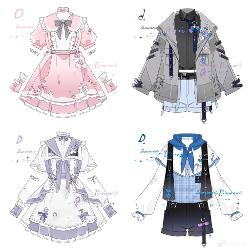 Midjourney Bot 更新时间:2026-02-17 00:42https://images.gogpt.vip/aigf/m_origin/20260216/1686785/f6ncvvevnsw9qxmx.jpg A:粉白蝴蝶结甜妹洛丽塔风服设 上衣 粉色短袖连衣裙,采用大翻领设计,领口处系着灰色大蝴蝶结,衣身点缀着小花与星星装饰,袖口为白色荷叶边,搭配粉色绑带手套,整体清新甜美,充满少女感。 下衣 多层粉色裙摆,裙摆处带有白色蕾丝花边,与上衣的蝴蝶结、花朵元素呼应,强化了洛丽塔的柔美感。 B:灰蓝机能风服设 上衣 叠穿设计,内搭黑色立领衬衫,外搭灰色宽松机能外套,外套上装饰着金属扣、蓝色飘带,颈部系着蓝色围巾,围巾上有黑色装饰,整体酷感十足,充满机能风的利落感。 下衣 浅蓝色短裤,腰部配有黑色皮带,与外套的机能元素呼应,凸显出干练又精致的气质。 C:白紫音符梦幻洛丽塔风服设 上衣 白色短袖连衣裙,采用吊带与蝴蝶结设计,衣身装饰着紫色蝴蝶结、音符与爱心图案,袖口为白色荷叶边,搭配紫色绑带手套,整体梦幻又充满音乐感,像一首温柔的小夜曲。 下衣 多层白色裙摆,裙摆处带有紫色蕾丝花边,与上衣的音符、爱心元素呼应,强化了梦幻洛丽塔的风格。 D:白蓝格纹清新休闲风服设 上衣 叠穿设计,内搭白色长袖衬衫,外搭蓝白短款背心,颈部系着蓝色围巾,围巾上有白色装饰,袖口为蓝色荷叶边,整体清新活泼,充满元气感。 下衣 黑色短裤,腰部配有黑色背带,背带上装饰着蓝色爱心与白色花边、蓝色元素呼应,凸显出清爽又可爱的气质。 --ar 1:1 --stylize 100 --iw 2 --niji 7