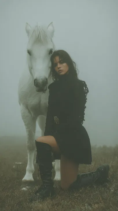 Midjourney Bot 更新时间:2026-02-17 00:44美女模特蜷缩依偎在一匹白马旁边,周围迷雾弥漫,身穿黑色时尚服装,荒原中,神秘,迷雾, 极简高端场景,艺术故事画面,胶片色彩,胶片摄影,全身拍摄 --ar 9:16 --v 7 --stylize 250