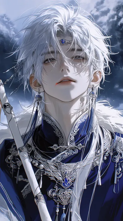 Midjourney Bot 更新时间:2026-02-17 00:52半写实风格,伪厚涂拟真,正面照,中景半身照,正方视角,精致年轻男人眼睛上挑黑色眼睛,白色长发,右侧低马尾,穿着深紫色的苗族服饰,戴着苗族银帽头饰,带着苗族银饰项圈,流苏耳坠,眼神犀利看镜头,眼尾微微泛红晕,嘴唇薄,拿着一把白色的玉笛,背景是苗疆有雾气的山林,柔和光线突出人物面部清晰,氛围柔和。 --ar 9:16 --stylize 1000 --niji 7