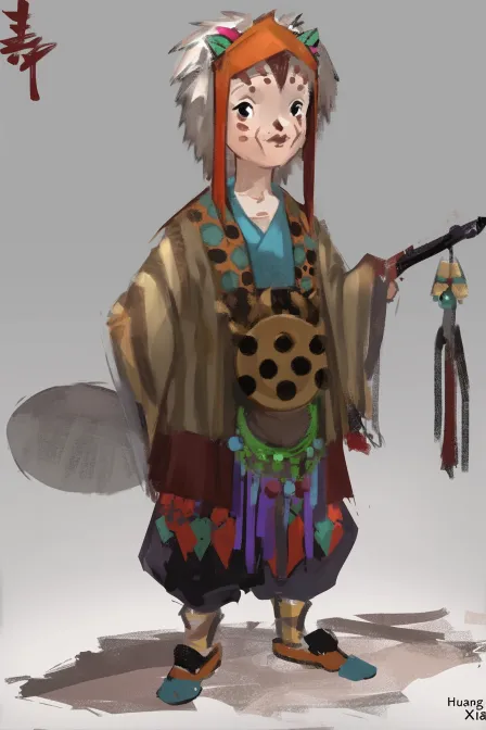 Midjourney Bot 更新时间:2026-02-17 00:47一位以东北民间信仰“黄仙”为原型的角色,呈现为10岁女孩的形态,但本质是灵体存在。她为半动物化设计,整体保持人类骨架比例,面部带有细微黄鼠狼特征:狭长的眼睛、略微上扬的颧骨、稍尖的鼻梁,表情冷静克制,目光机敏而成熟,不天真,不可爱。她的姿态略微前倾,身体修长轻盈,手指纤细,整体气质像一个观察世界的存在,而非普通儿童。 服装基于清末民初东北萨满服饰结构进行儿童比例改造,立领设计,分层暗色布料,低饱和土棕、暗红与琥珀色调。衣物边缘带有克制的皮毛装饰与少量民族纹样刺绣,佩戴小型符纸与护符元素,但不过度装饰。整体强调强烈清晰的轮廓剪影,结构明确,细节集中在服装层次与面部神态。 画面风格为半写实游戏角色设定图,干净中性背景,全身像,强调文化语境与民俗精神感。避免动漫风格、避免日本妖怪视觉、避免西方奇幻盔甲设计、避免可爱化或恐怖鬼童化。 a black woman with long white hair. She is wielding ainsert weapon. There is a white background. In the styleof demon slayer --ar 2:3 --stylize 100 --niji 6 --sref https://images.gogpt.vip/aigf/m_origin/20260217/1904027/tdbu514ya08tqcp1.png