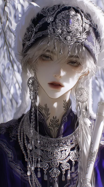 Midjourney Bot 更新时间:2026-02-17 00:53半写实风格,伪厚涂拟真,正面照,中景半身照,正方视角,精致年轻男人眼睛上挑黑色眼睛,白色长发,右侧低马尾,穿着深紫色的苗族服饰,戴着苗族银帽头饰,带着苗族银饰项圈,流苏耳坠,眼神犀利看镜头,眼尾微微泛红晕,嘴唇薄,脖子上有黑色的花草纹身,拿着一把白色的玉笛,背景是苗疆有雾气的山林,柔和光线突出人物面部清晰,氛围柔和。 --ar 9:16 --stylize 1000 --niji 7
