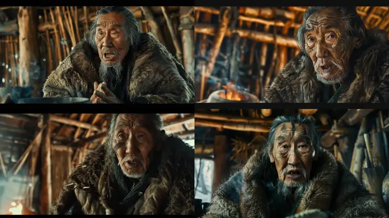 Midjourney Bot 更新时间:2024-07-14 00:09A native elder is speaking with an excited expression. In ancient times, the background is a house made of wood and animal skin, with a carbon brazier in the middle of the room. The texture of the movie is reminiscent of the visual effects of ancient Chinese mythological films cinematic style --cref