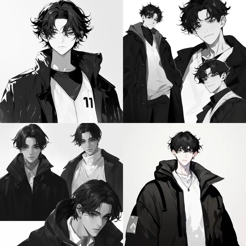 Midjourney Bot 更新时间:2024-07-15 00:00(Black and white style illustration)) ((Korean male anime)) ((high face)) ((black middle parting short hair)) ((front face, front face, front body)) ((wearing a black coat outside)) ((wearing a white vest inside)) --niji 6 --ar 1:1 --no Don't turn your face, don't do it sideways, colors
