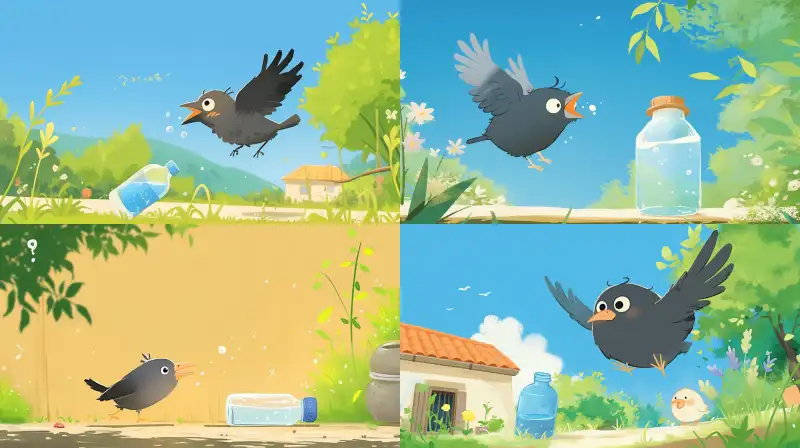 Midjourney Bot 更新时间:2024-07-12 00:02Once upon a time, there was a crow flying around in the hot summer, extremely thirsty. It searched for water sources everywhere and finally found a bottle in a yard with some water inside. The crow was very happy and quickly flew to the bottle, ready to drink water. Cute character --sref
