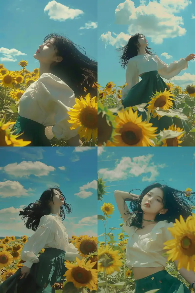 Midjourney Bot 更新时间:2024-07-12 00:03Full body portrait of a Chinese woman in her twenties, wearing a white top and green skirt, running on a sunflower covered grassland, with long black hair and blue sky and white clouds. --sref
