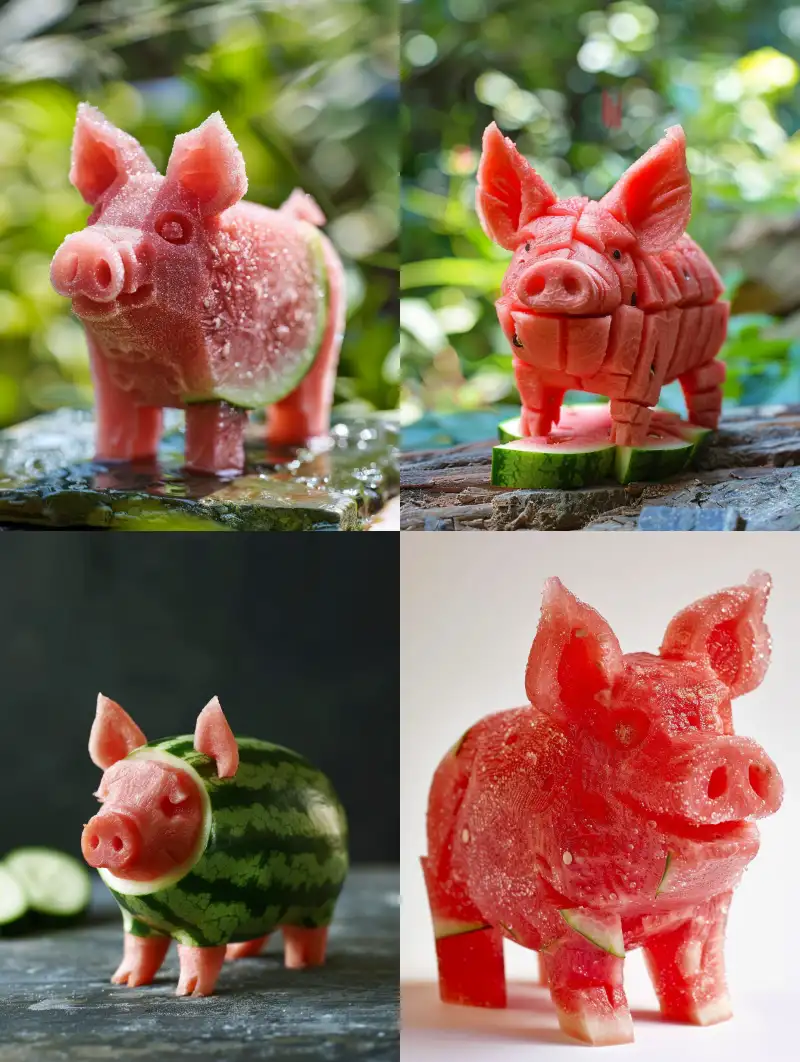 Midjourney Bot 更新时间:2024-07-12 00:04Pig made from watermelon, high saturation, standing --v 6.0 --ar 3:4 --style raw