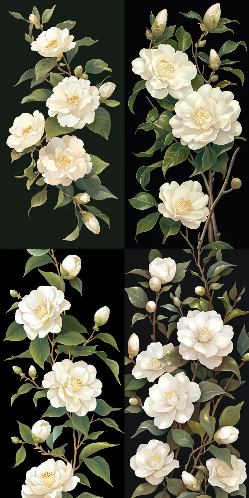 Midjourney Bot 更新时间:2024-07-09 00:02White camellia, independent of black background, left blank in the upper left corner, embossed art, watercolor illustration art style, flowers, leaves and branches, clear and sharp, flattened, --niji 5 --ar 1:2 --no Projection, shadow