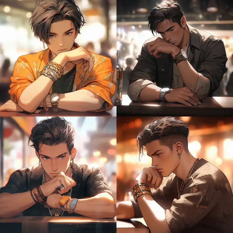 Midjourney Bot 更新时间:2024-07-09 00:04Chinese man, modern, young, 20 years old, handsome, handsome, sunny, wearing a ring and bracelet, set against the background of a bar, illustrated, paying attention to character details, realistic comic images, anime, details, high-definition, 8K, facing up, direct view --niji 5 --ar 1:1