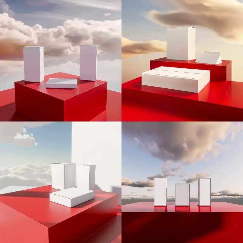 Midjourney Bot 更新时间:2024-07-09 00:05Packaging box display rendering, red platform, white box, sky and earth cover, flat rectangular box, three boxes, one facing up, one left side display, and one right side display, ultra realistic, ultra clear details, rendering effect, studio effect, warm light, 8K --v 6.0 --ar 1:1 --s 0