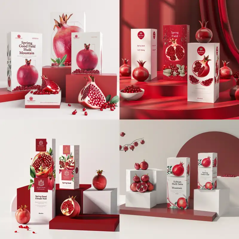 Midjourney Bot 更新时间:2024-07-09 00:07Packaging box display rendering, with three boxes: a red platform, a white box, a sky and earth cover, and a flat rectangular box. One box is upright on the front, one box is displayed on the left side, and the other box is displayed on the right side. It is super realistic, with ultra clear details, rendering effects, studio effects, warm light, and 8K. This picture shows the design of a packaging box used for the sale of soft seed pomegranates in Tunisia. The design adopts a red and white color combination to highlight the product's characteristics and attract consumer attention. There is a large diagram on the front of the box, which shows the cut surface of the pomegranate fruit and the rich fruit grains inside. The packaging also includes some textual descriptions about the product characteristics, such as "Spring Good Field", "Sichuan Huili Daliang Mountain" and other words, as well as some graphic elements to emphasize the quality of the product --v 6.0 --ar 1:1