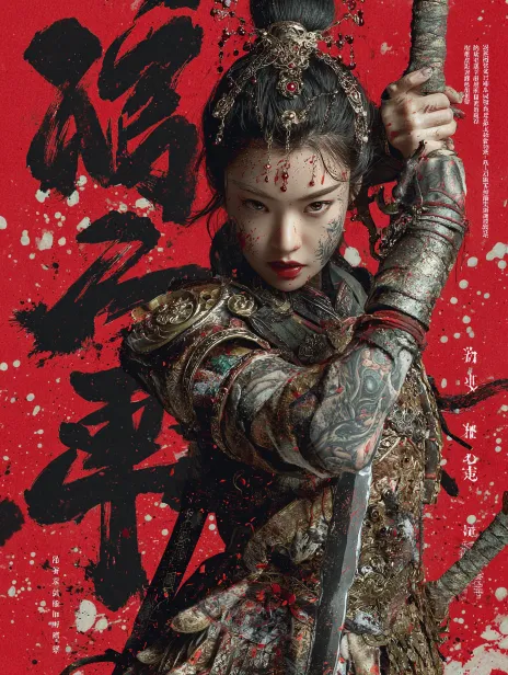 Midjourney Bot 更新时间:2026-02-16 00:00国风武侠女战士,高马尾,精致玉石发饰,全身覆盖复杂的传统纹身,黄金战衣,手持华丽长柄武器,悬浮战斗姿态,泼墨红色血溅背景,书法印章,超写实,8K,电影质感,强烈的视觉冲击力 --ar 3:4 --v 7 --style raw --stylize 100 --sref https://images.gogpt.vip/aigf/origin/20260129/1769683035108430_2.png --sw 0 --sv 2