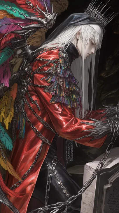 Midjourney Bot 更新时间:2026-02-16 00:00杰作, 顶级品质, 半写实, 电影般的插画,,动漫,清晰,复杂细节,最好的质量,超精细,高细节pixiv插画,画面8K清晰,暗色调,冷色调,天野喜孝风格。一个俊美动漫男人,侧身镜头,蜘蛛亮片背链,脊椎骨带有钻石,tassel背链,彩色大羽毛翅膀holding two wings,铁链colied缠绕叠戴,白色长直发,长发柔 顺,冷白皮,红色乳胶nun frock oversized,浪连帽王冠带有串珠流苏, 拿着剑,靠在墓碑上 --ar 9:16 --style raw --stylize 180 --niji 6 --no no