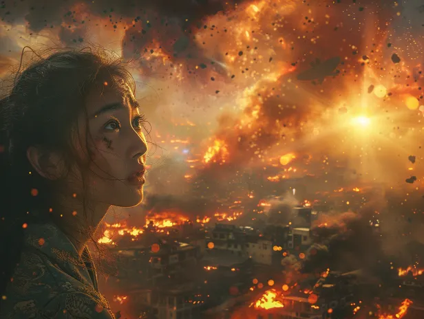 Midjourney Bot 更新时间:2026-02-16 00:02画面前景是一个拿着话题的中国年轻女人,一脸凝重正在着急的讲述着什么,背景是现代城市广场上,无数颗带火的陨石从高空砸向地面,地面上到处都是火焰,倒塌的建筑,和逃命的人,整体看起来非常混乱,有一种世界末日的感觉 --ar 4:3 --v 6.0 --stylize 600