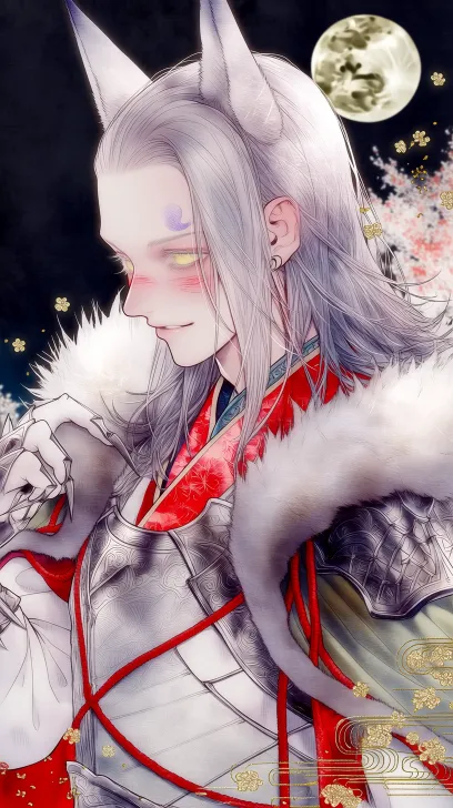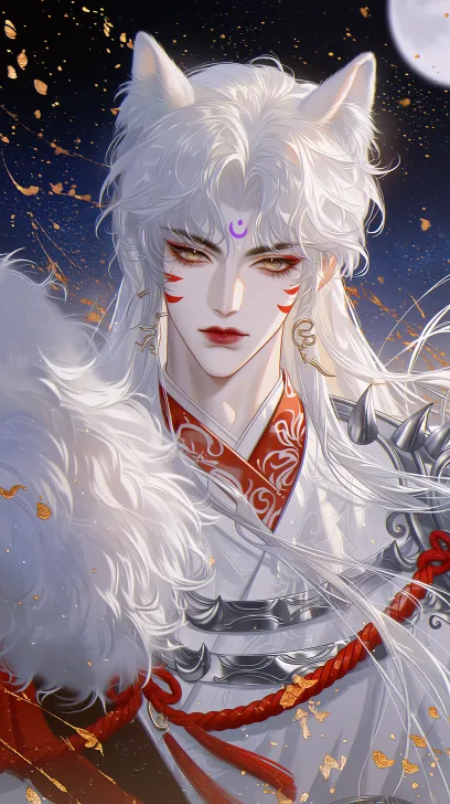 Midjourney Bot 更新时间:2026-02-16 00:04古代中国美男, 中国风格, 中国灰色富贵元素, 尖耳,犬妖,半妖,银发,长发飘逸,银白色长发, 精致妆容, 金色瞳孔, 冷冽眼神,额间紫色月牙纹,脸颊两撇红色妖纹,妖异俊美 身穿白色和服, 红色花纹衣领,白色狐裘披风,毛绒质感,金属肩甲,尖刺护甲,红色绳结装饰 夜晚,星月,星空背景,金色碎屑,花瓣飘落,冷色调,氛围感,清冷孤调,空灵,金质线稿,细腻光影,4K高清 细节丰富,近距离 --ar 9:16 --c 33 --weird 2480 --stylize 100 --niji 7
