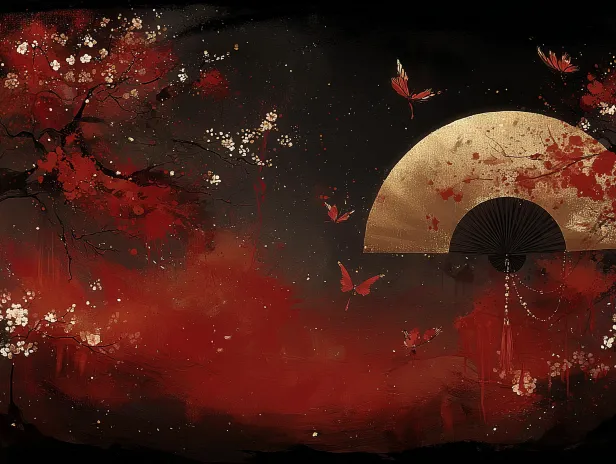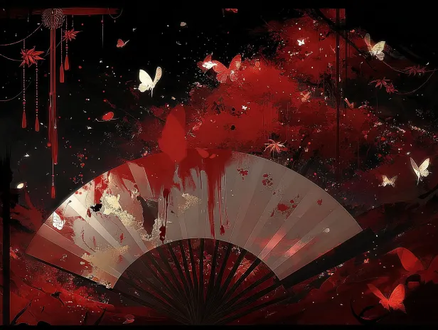 Midjourney Bot 更新时间:2026-02-16 00:04暗黑水墨仙侠风插画,黑红白三色为主,红色泼墨与血滴飞溅效果,金色金箔点缀,红白双色梅花枝桠,半透明的华丽团扇,扇面有精致的花纹和彩色珠链流苏,几只蝴蝶在扇前飞舞,呈现江湖气息,整体风格凌厉、肃杀又不失柔美,电影级光影,8K,超精细细节. --ar 4:3 --v 7 --stylize 100 --sref https://images.gogpt.vip/aigf/m_origin/20260215/2010801/c7oqp5s94fs7fg2d.jpeg https://images.gogpt.vip/aigf/m_origin/20260216/2010801/dqt47m9j8t18h54w.jpeg --sw 1000