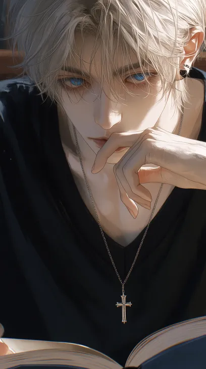 Midjourney Bot 更新时间:2026-02-16 00:04金色头发,瞳孔蓝色,美国白人,清冷帅气的16岁男高中生,穿着背心,单侧耳钉,发丝蓬松凌乱有层次,眼神阴郁偏执,身着一件黑色宽松V领毛衣,微塌的领口露出精致锁骨,颈间戴着一条银色十字架项链。仰头看向镜头,指尖轻抵唇边,坐在图书馆,另一只手捏着一本书。大眼睛,五官立体,高挺鼻梁,眼窝深邃、睫毛分明,皮肤纹理清晰可见,发丝分明。 画面采用半厚涂画风、2.5D分层效果、半写实质感、3D渲染,带有电影颗粒质感;冷调侧光搭配柔和光影,画面朦胧,整体氛围颓废又静谧,仰拍,细节拉满,8K超清画质,营造出颓废又精致的氛围。 --ar 9:16 --c 7 --stylize 777 --niji 7