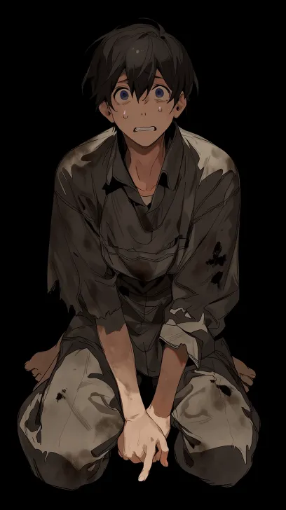 Midjourney Bot 更新时间:2026-02-16 00:06一个男生身上穿的是一件洗得发白的深色粗布褂子,衣服上面沾着灰尘、泥渍,还有几处不明的暗色印子,褂子的袖口磨破了边,露出细瘦的手腕;裤腿卷到膝盖,脚踝细瘦,没有穿鞋,跪坐,双膝着地,头发是黑色的短发,大眼睛,眼珠蓝色,眉头紧蹙,眼眶泛红,嘴唇哆嗦,眼神里满是恐惧和哀求,小拇指伸直,指盖处泛白 虚幻引擎5, --ar 9:16 --stylize 100 --niji 7
