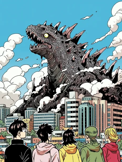 Midjourney Bot 更新时间:2026-02-16 00:07https://images.gogpt.vip/aigf/m_origin/20260215/2056973/7j11jcg6egybyisj.jpg 漫画风格,彩色,巨大的未知生物破坏城市,五位身着黑色、粉色、黄色、绿色、红的的战士仰望这些怪物 --ar 3:4 --stylize 100 --iw 0.25 --niji 7