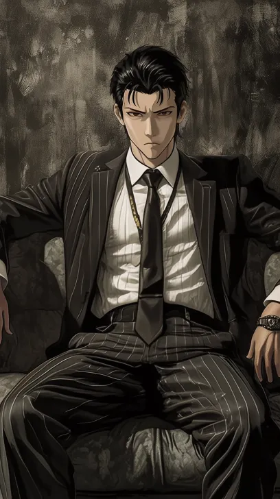 Midjourney Bot 更新时间:2026-02-16 00:07背景为深炭灰色带细腻颗粒肌理,风格复古实验风,传递朦胧,一个俊美动漫男人,身穿西装,领带,黑色碎花西服裤,坐在沙发上 --ar 9:16 --style raw --stylize 180 --niji 6 --no no
