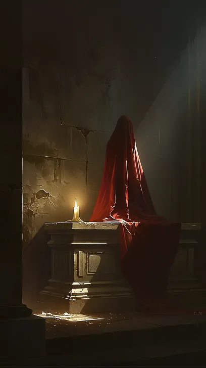 Midjourney Bot 更新时间:2026-02-16 00:10老旧祭神暗室,空间狭小封闭,墙面斑驳,石台摆着神像(被红布通体包裹),台前一支白烛摇曳,烛火光影在墙面和神像上晃动 虚幻引擎5, --ar 9:16 --stylize 100 --niji 7