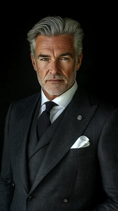 Midjourney Bot 更新时间:2026-02-16 00:12黑色背景。人像摄影,一位60岁的欧洲男性,拥有典型的贵族气质和商业帝国掌舵者的威严。他的满头银发浓密柔软,一丝不苟地向后梳理,散发着自然的光泽,鬓角修剪精致。他的面容兼具慈祥与威严——高挺的鹰钩鼻,深邃的灰蓝色眼睛,,下颌线条依然分明,面部轮廓棱角分明。他身穿剪裁极致的定制西装三件套——深灰色或海军蓝的西装外套、贴身马甲和长裤,内搭白色法式衬衫配双层叠袖,系着低调奢华的深色丝绸领带,领带结完美对称。西装马甲贴合身形,胸前口袋露出折叠整齐的白色口袋巾,马甲下方隐约可见精致的银色怀表链。他的整体气质是慈父与君王的完美融合——既有对家人的温柔庇护,又有对敌人的雷霆手段。4K,写实风格 --ar 9:16 --v 6.1 --stylize 100