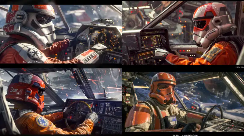 Midjourney Bot 更新时间:2024-07-05 00:03Side view, screenshot of the video game "Star Wars X-Wing Fighter", a pilot wearing a helmet sitting in the cockpit, holding the steering wheel with his left hand and the handbrake with his right hand, watching through the windshield and displaying it on a monitor on the console. The screenshot is taken from PlayStation 5 and adopts the style of Lucas Pictures --v 6.0 --ar 16:9