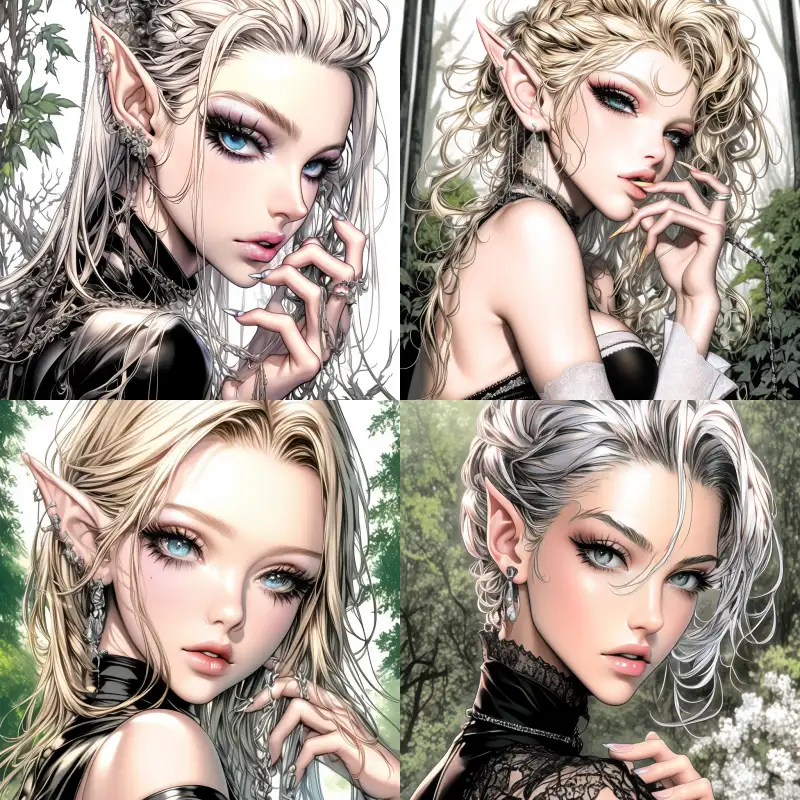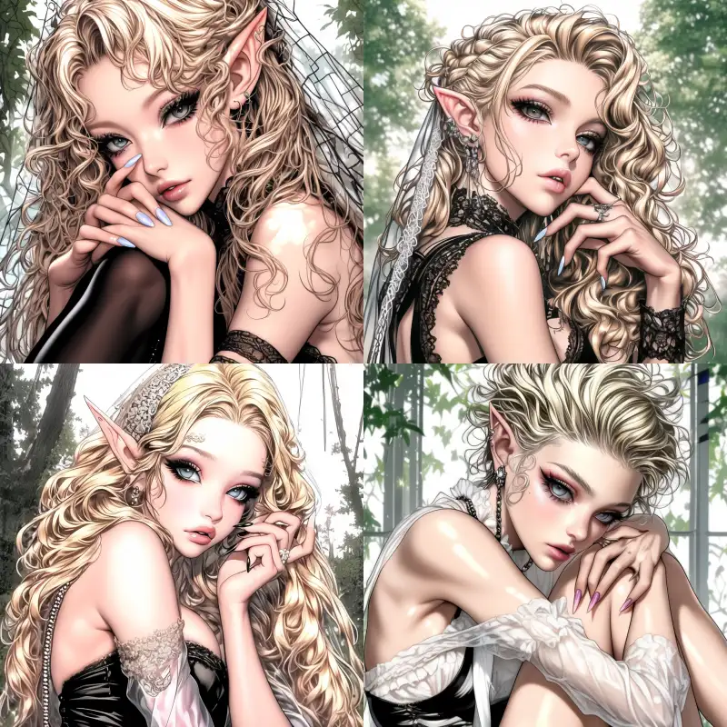 Midjourney Bot 更新时间:2024-07-03 00:04A mature woman with elf ear yellow hair. Elf Queen. Mature body shape. He has a delicate makeup on his face. Women have oval face, double eyelids, long eyelashes, delicate nose, full mouth, eye shadow, eyeliner, etc. Smoky makeup, cut eye shadow has sequins shining. Futurism. The background is a dreamy forest garden. The elf woman sat on a bed with a veil. Lip nails, chains. Chain. --sref