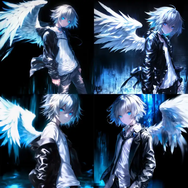 Midjourney Bot 更新时间:2024-07-03 00:04A cartoon boy with white hair, blue eyes, and white wings on his back, dressed in black and white clothes against a dark background. Full body photos are in a high-definition and high-resolution anime style. A cool color scheme and cool posture with an angelic face against a pure background. The boy is wearing a white shirt. --sref