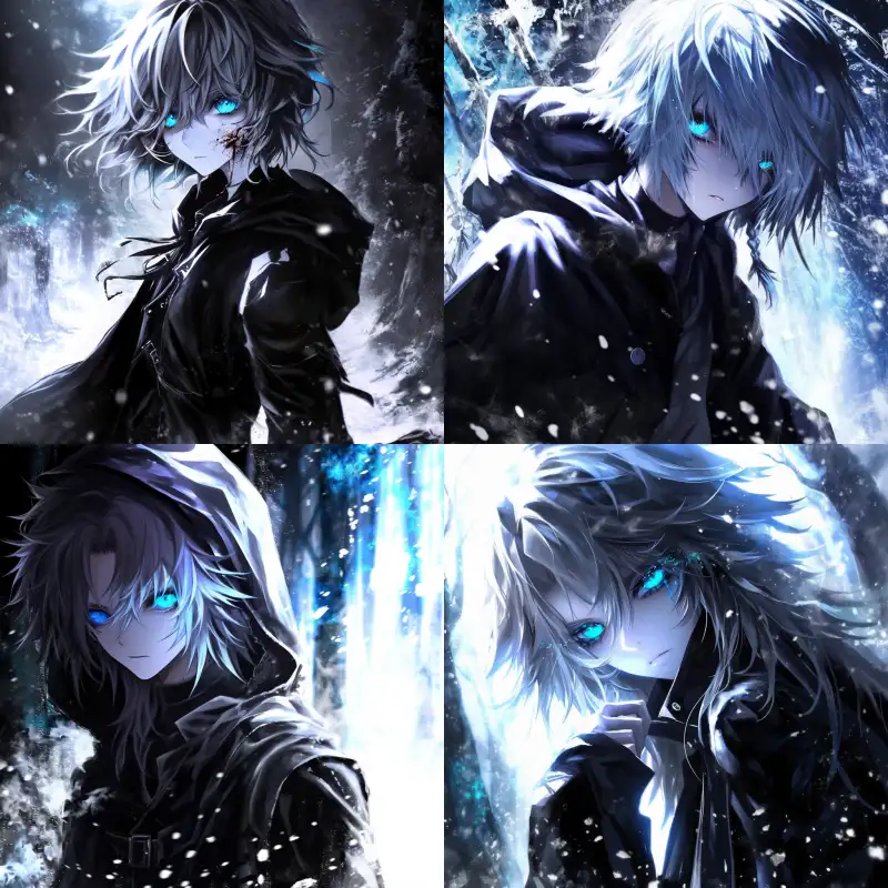 Midjourney Bot 更新时间:2024-07-03 00:00Black and white manga, a long haired boy wearing a black suit and cloak, with a sad expression, blue eyes, anime style, soft light shining on his face, surrounded by trees, snowflakes falling around him. The background is blurry, creating a sad atmosphere --sref