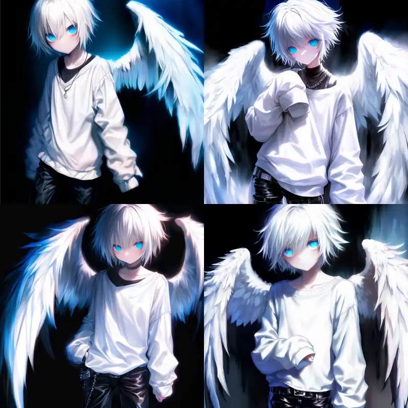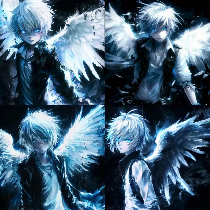 Midjourney Bot 更新时间:2024-07-03 00:03A cartoon boy with white hair, blue eyes, and white wings on his back, dressed in black and white clothes against a dark background. Full body photos are in a high-definition and high-resolution anime style. A cool color scheme and cool posture with an angelic face against a pure background. The boy is wearing a white shirt. --sref