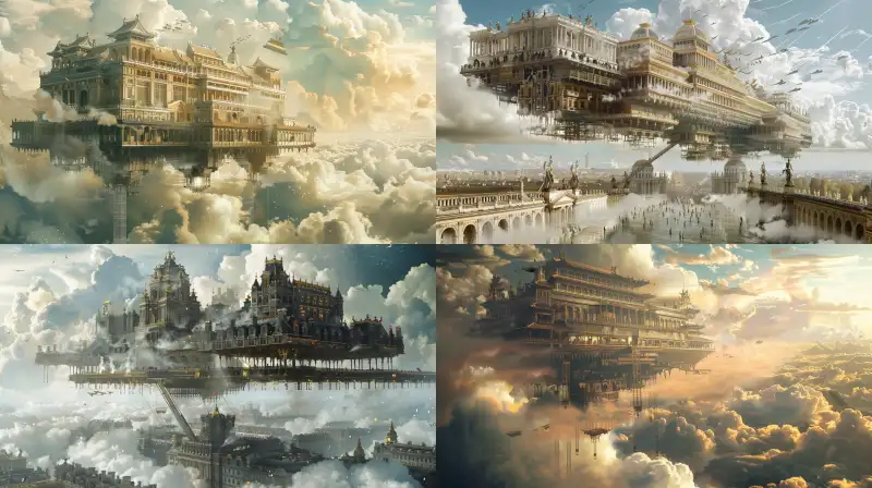 Midjourney Bot 更新时间:2024-06-26 00:00Futurist two-layer creative structure, with a huge 17th century Forbidden City suspended above the Palace of Versailles in France at the center. The Forbidden City is connected to the Palace of Versailles by a ladder, with ancient people climbing, virtual and real, full of imagination, full of technological sense, with bright sky and clouds, shrouded in clouds and mist, flowing light and colorful, starry and brilliant, glass sugar paper, golden composition, Chinese 3D, conceptual design, conceptual light and shadow, conceptual comics, realistic lighting rendering, exquisite details, high-definition, 8k --ar 16:9 --v 6.0