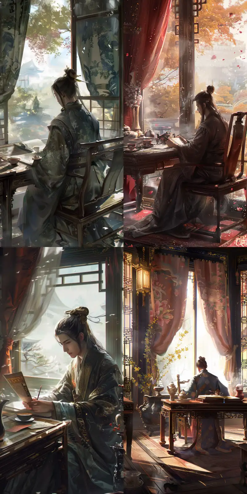 Midjourney Bot 更新时间:2024-06-26 00:03In a magnificent study, a nobleman in a magnificent robe sat at an oak desk, focused on flipping through ancient scrolls. There are exquisite tea sets placed in the study, emitting a fragrant tea aroma. The scenery outside the window is pleasant, with sunlight shining through the magnificent curtains into the room, adding a warm touch of color to the entire space. However, the aristocrat's gaze revealed a hint of worry, as if unable to escape some indescribable pressure and anxiety. --ar 1:2 --style raw --v 6.0