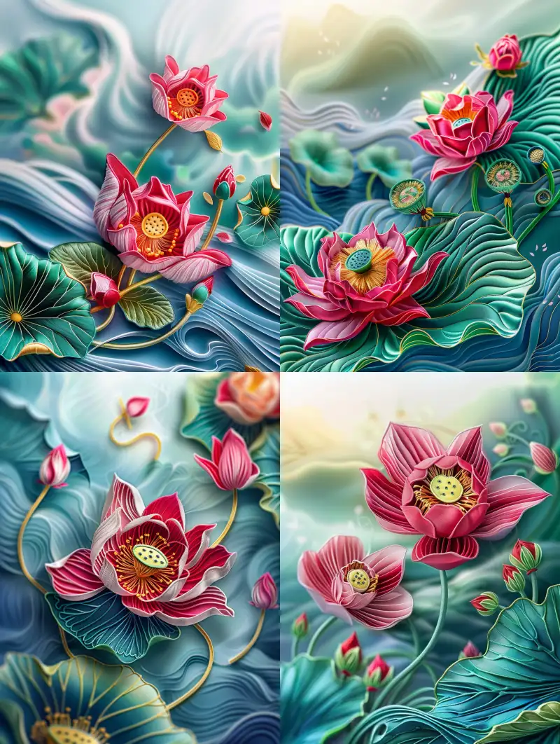 Midjourney Bot 更新时间:2024-06-24 00:01The combination of paper art and embroidery art, lotus flowers are three-dimensional embroidery, and lotus leaves are made of paper. The background is blurred, the colors are full and bright, and the colors are gradually changing. Feather art is very beautiful, three-dimensional art, macro close-up --sref