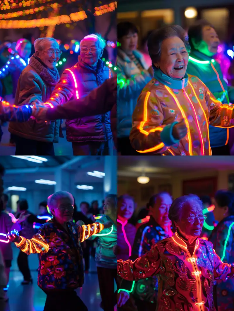 Midjourney Bot 更新时间:2024-06-24 00:02A group of elderly Chinese people dancing square dancing indoors, with neon lights on their tops and tops --ar 3:4 --v 6.0
