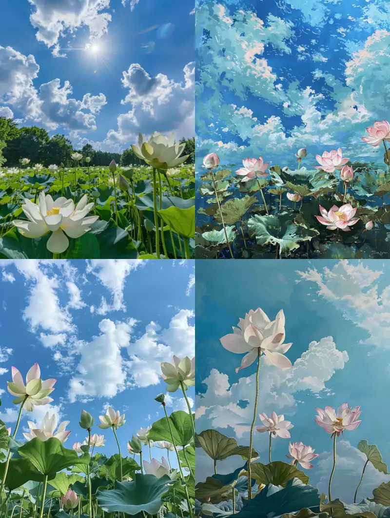 Midjourney Bot 更新时间:2024-06-24 00:04Up shot, blue sky and white clouds, shooting at the bottom of lotus flowers, --ar 3:4 --v 6.0