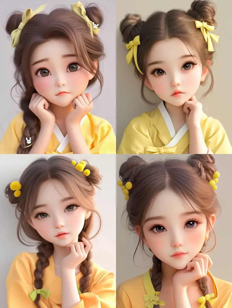 Midjourney Bot 更新时间:2024-06-22 00:093D cartoon, a cute Korean girl with round big eyes, braided hair, wearing green Hanfu, holding her chin with one hand. Her little bun is decorated with a green bow. The background is light gray, creating a soft focal effect that emphasizes the cuteness of the character's face and clothing. Her expression exudes the innocence and playfulness of Pixar style. --sref