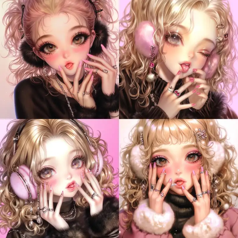 Midjourney Bot 更新时间:2024-06-22 00:09A smooth face, oval face, beautiful brown eyes, long eyelashes, light powder blusher, delicate nose, full mouth smeared with light pink lipstick shiny anime girl. Lick your fingers, spit out your tongue and hang water droplets. Eyes blurred. Eyes blurred. Wearing furry earmuffs. Yellow curly hair with many hair clips and accessories. Shiny crystal. Shining nails, necklaces, bracelets, earrings. Added a fashionable appearance and enhanced the overall beauty of the scene. Pose. The background is pure white. Detailed. --sref