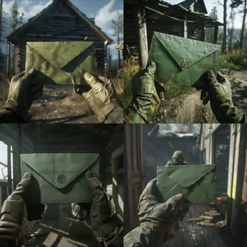 Midjourney Bot 更新时间:2024-06-21 00:07In the center of the screen, there is a green email envelope with a seal on it. A soldier wearing modern US military equipment, wearing military gloves and hands, delivers the envelope diagonally to the camera position. The angle of the envelope is slightly tilted, and the character's chin can be seen. The background is a simple farm cabin, escaping the Tarkov tone, with evening sunshine and cinematic light and shadow. It has high resolution and cinematic feel, with a 1917 movie style and CODM style. The composition of the picture presents a large perspective, super realism, and cinematic level shots --ar 1:1 --v 6.0