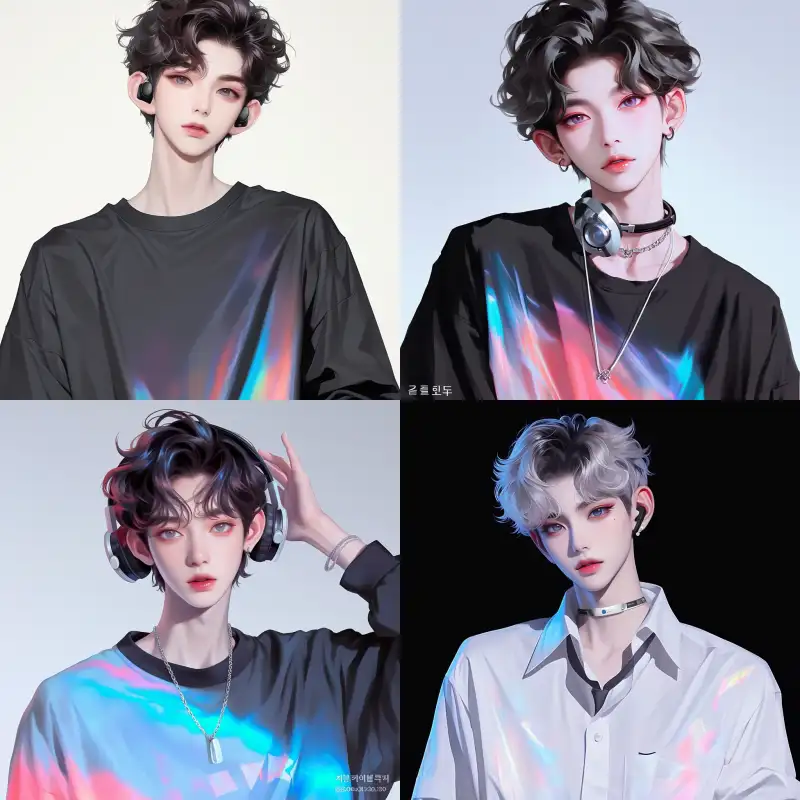 Midjourney Bot 更新时间:2024-06-21 00:07A handsome Korean idol boy, front view, half body photo, exquisite facial features and makeup, carefully designed, with pink short hair, wireless headphones on top, strong sense of detail, wearing black glossy laser clothing, pure white background, high quality, high detail, high resolution, ultra clear, photo level realism, professional photography, very detailed and realistic, 16K, --sref