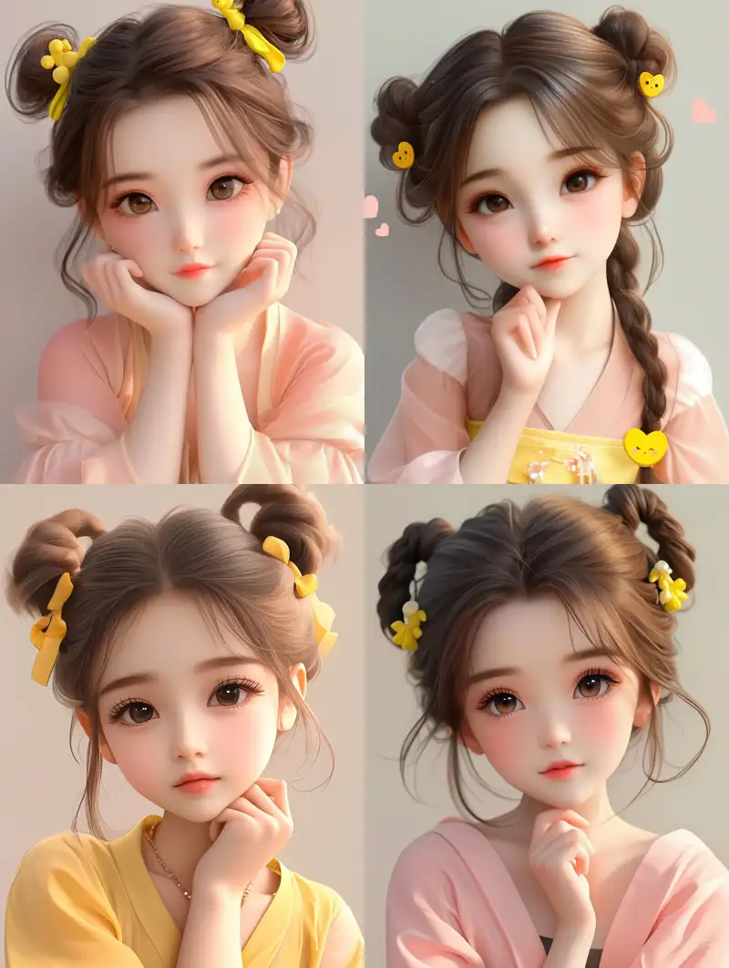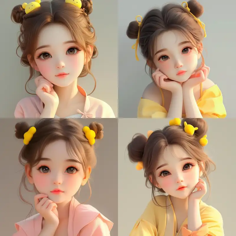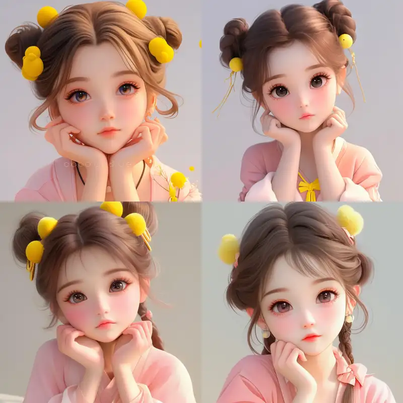 Midjourney Bot 更新时间:2024-06-22 00:013D cartoon, a cute ancient style girl with round big eyes, braided hair, wearing pink Hanfu, holding her chin with one hand. Her little bun is adorned with a cute bow. The background is light gray, creating a soft focal effect that emphasizes the cuteness of the character's face and clothing. Her expression exudes the innocence and playfulness of Pixar style. --sref