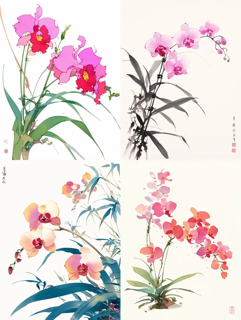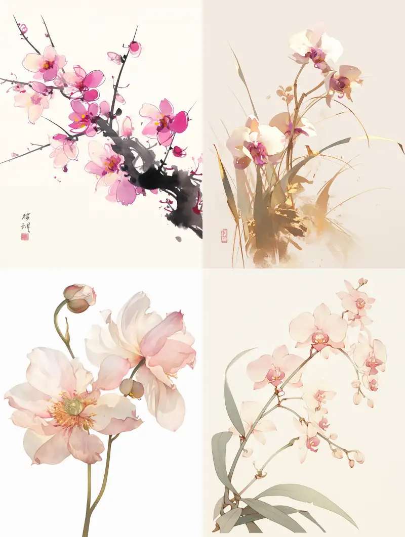 Midjourney Bot 更新时间:2024-06-21 00:02A Chinese orchid painting with a white background and pink, in a plain style, featuring detailed illustrations and hand drawn lines in the style of a Chinese artist --ar 3:4 --niji 6