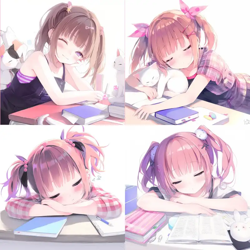 Midjourney Bot 更新时间:2024-06-21 00:03Japanese manga style girl lies on the desk, sleeping with a book in front of her. Pink double ponytailed girl, sunny and cute, with a round face --sref