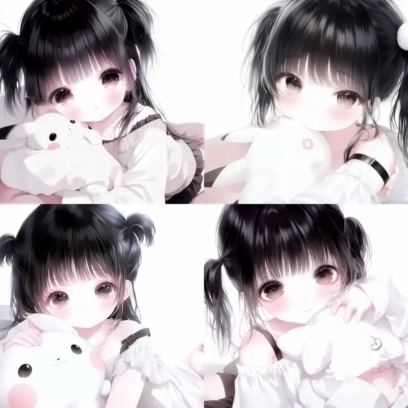 Midjourney Bot 更新时间:2024-06-21 00:00A little girl, with black hair and bangs, tied in ponytails, wearing a white dress, holding a Pikachu doll in her arms, close-up of her upper body, with a pure white background, --sref