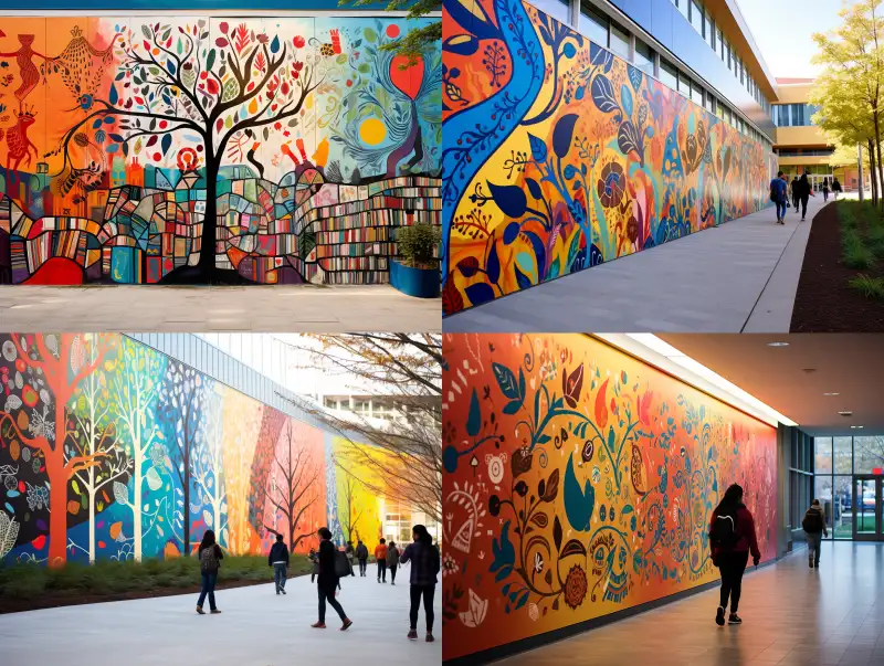 Midjourney Bot 更新时间:2024-06-20 00:02A campus cultural wall, it is a huge canvas painted with rich and colorful patterns and text. The pattern features jumping notes, flowing poetic lines, as well as vibrant plants and tangled vines. These patterns and texts seem to be telling people about the little things that happen on campus, emitting a vibrant and creative light. And the entire cultural wall is like an open book, recording the sparks of students' thoughts and growth footprints, showcasing the diversity and inclusiveness of campus culture. --ar 4:3 --v 5.2